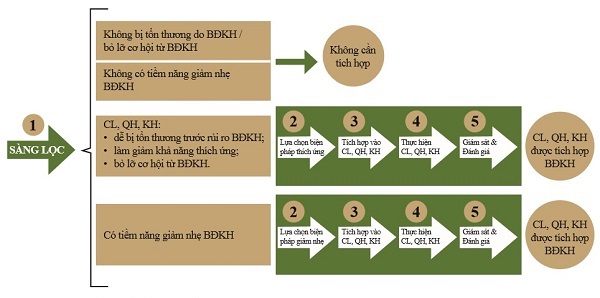Về các bước lồng ghép cụ thể, theo tài liệu “Hướng dẫn kỹ thuật về tích hợp vấn đề BĐKH vào kế hoạch phát triển” do Bộ TNMT và Chương trình Phát triển của Liên Hợp Quốc (UNDP) phối hợp xuất bản năm 2012, quy trình lồng ghép BĐKH trong các chiến lược, quy hoạch, kế hoạch, chương trình, dự án, đề án… nhìn chung gồm 5 bước: Sàng lọc và đánh giá tác động; Lựa chọn biện pháp thích ứng; Lồng ghép vào chiến lược, quy hoạch, kế hoạch; Thực hiện chiến lược, quy hoạch, kế hoạch; Giám sát và đánh giá. Trong đó, Bước 1 và Bước 2 rất quan trọng, cần được thực hiện chi tiết.