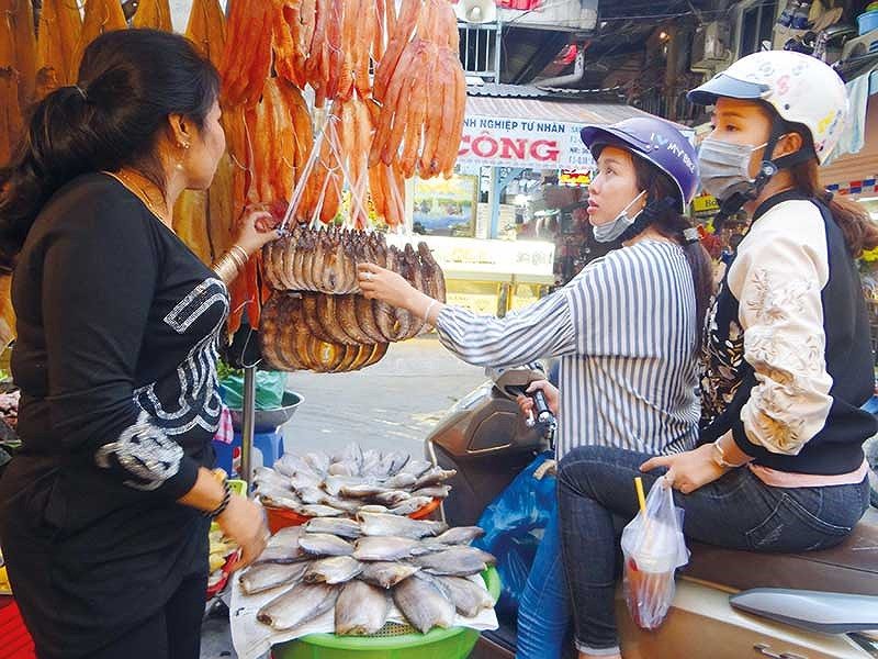 Những ngày cuối năm, sạp hàng của chị Mai nườm nượp khách. Phần lớn họ mua các loại khô xuất xứ từ Campuchia. Từ khô nhái (dân nhậu gọi là vũ nữ chân dài), khô cá sặc, khô cá lóc, khô cá tra đến cá trèn ở đây đều có. Tôi để ý thấy khô cá trèn ở đây rất lạ, có màu nâu đen óng ánh gần giống như màu nâu cánh gián, giá bán 520.000 đồng một xâu chưa tới chục con.
