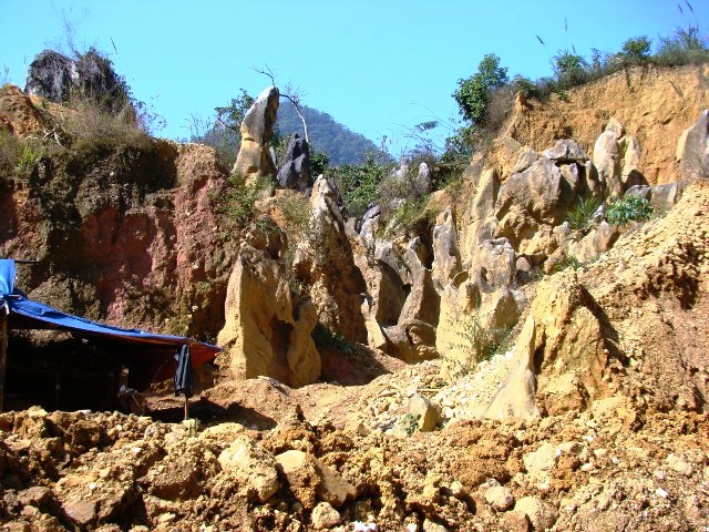 Trên đường đi, cảnh tượng đập ngay vào mắt chúng tôi là những gốc đinh, nghiến, trai có lẽ tới vài trăm năm tuổi bị phạt ngang gốc. Có những gốc nghiến có đường kính tới 0,8m. Ngay cạnh những gốc nghiến là những “ao vàng” sâu hoắm rộng hàng ngàn m2 như một vực sâu.