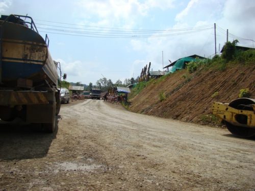 Không khó để dịch mấy dòng chữ Lào ghi ở tấm bảng chỉ dẫn vào công trường, đoàn chúng tôi nhằm con đường mới mở mà đi. Hai bên đường là những “núi” vật liệu xây dựng đang được tập kết. Đi qua một hai bản có người dân sinh sống thì con đường bắt đầu lên đèo dốc. Dọc đường rất nhiều xe tải chở dầu qua lại. Giữa đỉnh đèo, nơi có máy móc đang thi công đường, là tấm biển nhắc nhở những xe không phận sự miễn vào. Chúng tôi xuống xe và hỏi người chỉ huy đơn vị đang thi công để vào trong với lý do lâu ngày không về thăm làng, thăm anh em họ hàng trong đó và được họ đồng ý cho vào.