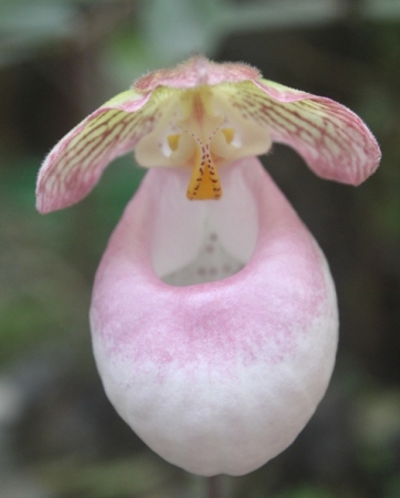ThienNhien.Net – Hài mốc hồng còn được biết đến với cái tên Hài ngọc nữ (Paphiopedilum micranthum), phân bố chủ yếu ở miền Bắc Việt Nam (tập trung tại các tỉnh Cao Bằng, Hà Giang, Tuyên Quang) và vùng Quảng Tây, Quý Châu, Vân Nam (Trung Quốc). Cây có 3-5 lá dài 25 cm, rộng 3 cm, dò hoa dài 9-25 cm, hoa như một chiếc muôi lớn dài 10 cm, rộng 5-6 cm, thường nở vào khoảng tháng 3 đến tháng 5. Hoa rất giống với hoa một số loài Đỗ quyên có mật và thường thu hút côn trùng tới thụ phấn.