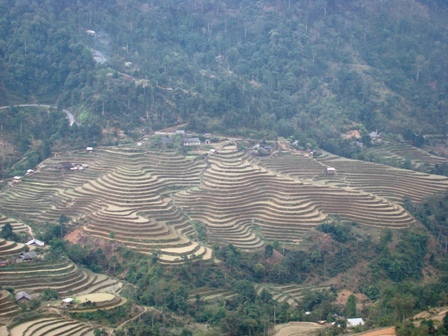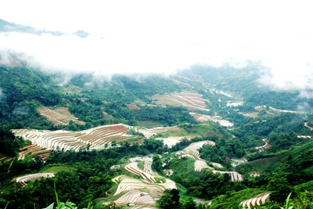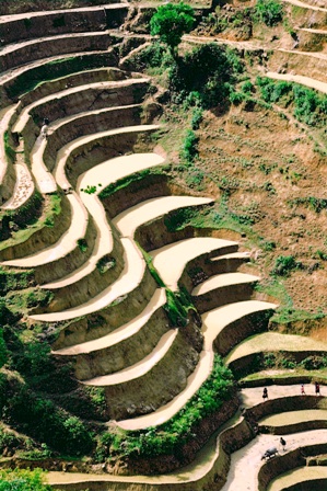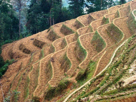 Hàng nghìn thửa ruộng bậc thang cỏ mọc um tùm ngày nào giờ đã được cày xới, bừa ải, tạo thành những bờ bao uốn lượn nhịp nhàng như những dải lụa trắng tinh khôi.