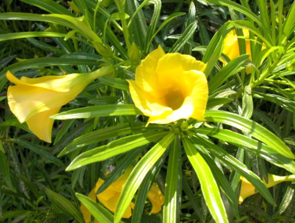 ThienNhien.Net – Sắc vàng rạng rỡ của những đóa hoa Thông thiên thật nổi bật trên nền lá xanh mát mắt. Thông thiên (Thevetia peruviana) hay còn gọi là Huỳnh liên là loài cây gỗ nhỏ thuộc họ Trúc đào, xuất xứ Nam Mỹ và Mexico. Hoa Thông thiên có dạng loa kèn với năm cánh lớn. Ở Việt Nam, hoa thường có màu vàng rực nhưng nếu có dịp tới những miền đất khác trên thế giới, bạn sẽ thấy loài hoa này mang cả màu vàng cam hoặc đôi khi là màu trắng nữa. Tuy đẹp là thế nhưng cũng như người họ hàng Trúc đào, tất cả các bộ phận của cây Thông thiên, đặc biệt là hạt và quả, đều có chứa các loại độc tố. Trong số đó, nguy hiểm nhất là thevetin – một hợp chất có tác dụng cường tim được sử dụng trong y dược nhưng ở dạng tự nhiên lại là chất kịch độc, có thể gây tử vong cho người.