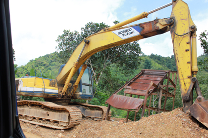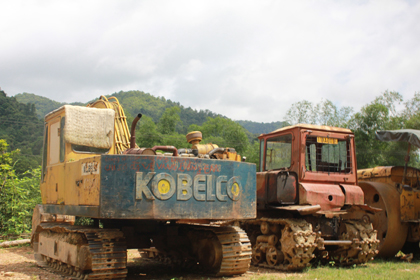 Men theo con đường độc đạo, chúng tôi tiếp tục đi sâu vào “đại bản doanh” của nạn khai thác vàng phía xã Minh Khai. Những gì chúng tôi bắt gặp là la liệt máy xúc nằm hai bên đường, nhiều máy bơm cũng nằm “ngửa bụng” phơi nắng trước các ngôi nhà cửa đóng kín mít.