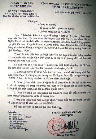 Trao đổi với báo Nông thôn ngày nay, ngày 18/7/2012 ông Hoàng Văn Mão, Chủ tịch UBND huyện Chợ Đồn cho biết: “Vụ việc khai thác quặng lậu vừa được chuyển sang cho công an tỉnh Bắc Kạn điều tra. Sự việc bị bưng bít như vậy chắc chắn có người đứng đằng sau”. Một trong những người mà ông Mão nhắc đến có hành vi tiếp tay, thậm chí là “đóng cổ phần” vào khu khai thác quặng này là một công an huyện Chợ Đồn. Đó là lý do mà ông Mão không đề nghị công an huyện Chợ Đồn tiếp tục điều tra vụ việc.