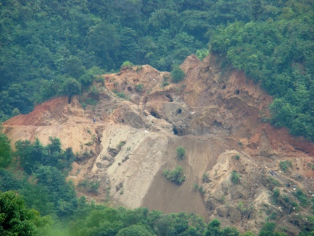 Quả thật, khi đứng từ điểm trường phóng tầm mắt ra xa có thể dễ dàng nhìn thấy hàng chục lán trại được lợp bạt màu xanh lấp ló dưới những tán cây rừng, quan sát kỹ thì thấy nhiều thanh niên đang hì hục xúc đất bỏ vào bao tải đặt cạnh các hang vàng sâu hút. Đây là một “công trường” khai thác vàng trái phép .