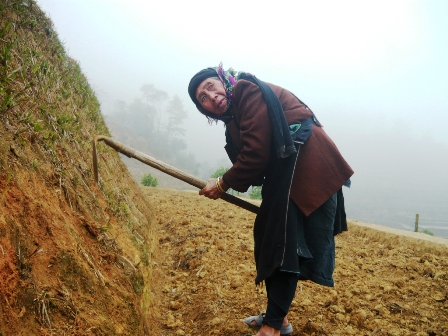 Một trong những “nghệ nhân” đáng kính đó là cụ Vàng Thị Dể, người La Chí, năm nay tuy đã bước sang tuổi 82 nhưng cụ vẫn tiếp tục tham gia công việc chế tác, giữ gìn và bảo vệ từng thửa ruộng bậc thang. Cụ cho biết, ruộng bậc thang khó nhất là lúc khai hoang, tiếp nữa là công tác đắp bờ chuẩn bị cho mùa cấy vì nếu làm không tốt, mưa nhiều sẽ dễ gây vỡ bờ, người dân nhiều nơi phải kè đá hoặc đóng cọc xung quanh. Nếu không làm kiên cố, khi vỡ bờ là đất màu trôi hết, thậm chí thửa ruộng trên vỡ, thửa dưới và nhiều thửa dưới nữa cũng vỡ theo. Từ xưa đến nay, dụng cụ để phục vụ cho sản xuất lúa trên ruộng bậc thang là cuốc, cào, cày với sự giúp sức của trâu kéo.