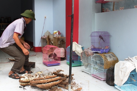 Vào đầu tháng 9, trong một chuyến công tác tại trung tâm thị trấn, khi ghé vào một quán ăn ven đường, chúng tôi bắt gặp hình ảnh nhiều tổ ong bò vẽ có đường kính rộng chừng nửa mét được bày la liệt ngay trước cửa quán, xung quanh có tới hàng chục lồng chim rừng đủ chủng loại, từ cu gáy, yểng đến chích chòe, khiếu… được bày bán.