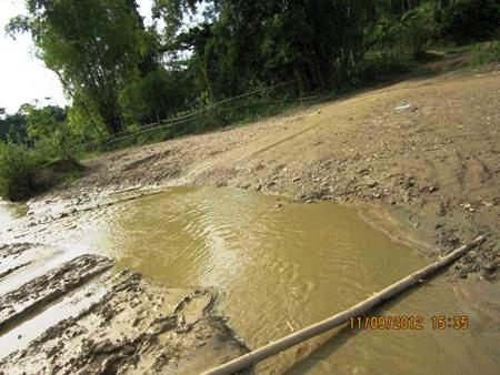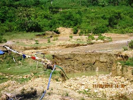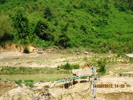 Do được canh phòng cẩn thận nên khi tôi vừa tới nơi thì tất cả máy bơm đã bị tắt, sàng tuyển vàng và đồ dùng khai thác vứt chỏng chơ giữa ruộng. Những hang hố nằm giữa những đám ruộng, soi bãi mới được bơm cạn nước nên sâu hoắm, có hố sâu khoảng 5 mét, toàn bộ một khu đất bằng phẳng làm ruộng trước kia đã bị san ủi, đào bới nhiều lần, nay chỉ còn là bãi nham nhở toàn sỏi đá. Trong lúc tiến đến ngó xuống các hang đào vàng, một người dân bản địa đang chăn bò gần đó cho hay: “các anh chỉ vào đến đầu thôn, ở đây đã nghe thấy họ gọi nhau tắt máy bơm rồi”. Biết đám phu vàng vừa ra khỏi các sàng tuyển, chúng chỉ ẩn náu đâu đó quanh mấy cái lán phía trên sườn núi, tôi đã quyết định leo lên đó bắt chuyện.