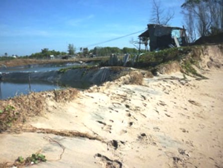 Theo quan sát của chúng tôi, hiện nay vào những lúc triều cường dâng cao, sóng biển đập mạnh đã và đang phá hủy gần hết bờ bao chắn sóng của những hồ nuôi ngoài cùng, nước có thể tràn vào hồ bất cứ lúc nào. Một số người lo lắng nếu để nước tràn vào những hồ nuôi tôm này thì chẳng mấy chốc nó sẽ phá hủy toàn bộ bờ bao của những hồ nuôi phía trong, như vậy thiệt hại sẽ rất lớn.