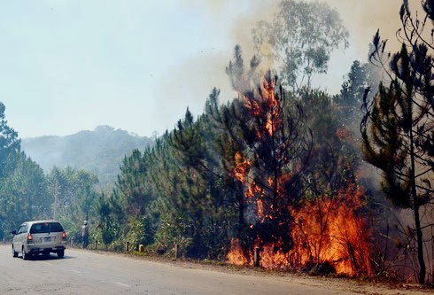 Gần 13h, trên đèo Mimosa đoạn gần Bệnh viện Hoàn Mỹ ở TP Đà Lạt (Lâm Đồng) xảy ra vụ cháy rừng thông, khói mù mịt gây cản trở tầm nhìn của các phương tiện đang lưu thông trên đèo. Phát hiện hỏa hoạn, những người nhận khoán bảo vệ rừng cùng kiểm lâm dùng thau chậu lấy nước hắt vào đám cháy và bẻ nhánh thông để đập lửa.
