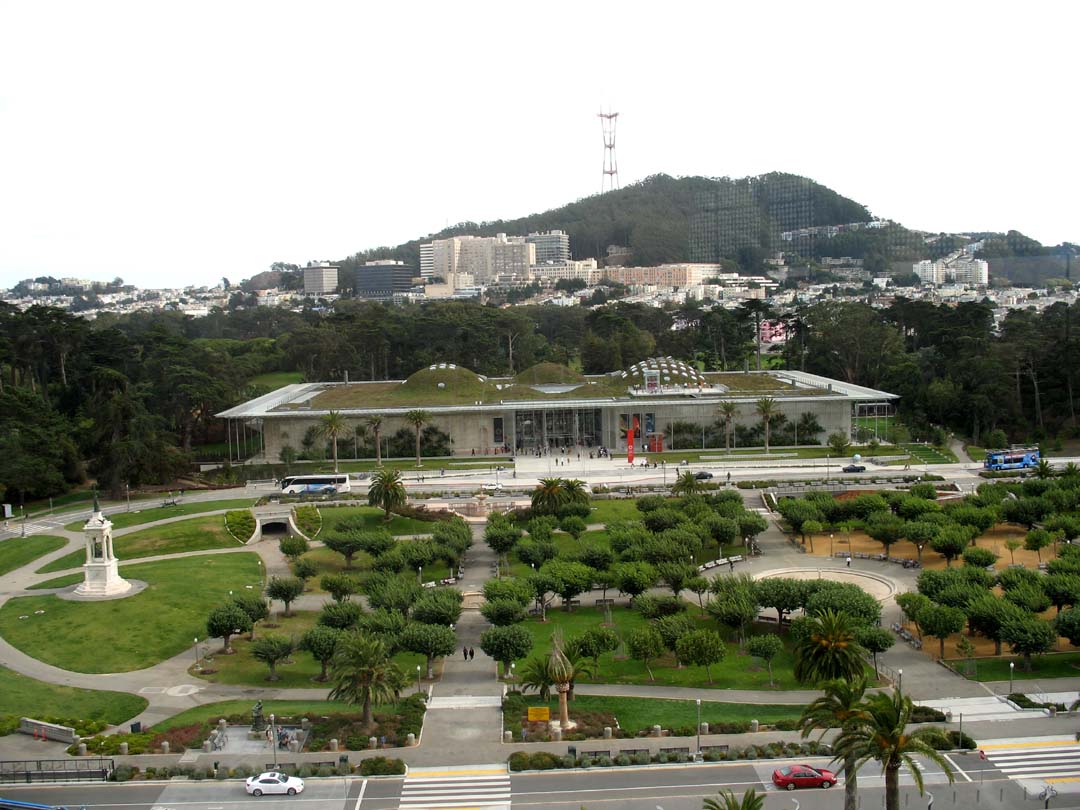 Những ngọn đồi nhấp nhô dưới những tán cây rộng đến 10.000m2, giúp cho tòa nhà hài hòa với không gian xanh của công viên Golden Gate bao quanh. Chúng cũng giúp bảo tồn năng lượng, bởi mái cách ly và thông gió cho bảo tàng ở bên dưới.