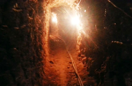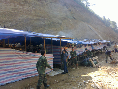 Tại công trường khai thác vàng, cảnh tượng đầu tiên đập vào mắt PV báo điện tử Người đưa tin là hệ thống lán trại rất quy mô được bao bọc kín cùng phương tiện máy xúc nằm ngổn ngang dưới taluy đường. Vài chục công nhân với khuôn mặt dữ dằn, đều còn tuổi đời khá trẻ, kẻ đứng người ngồi đưa mắt nhìn về phía khách lạ với con mắt hình viên đạn. Đúng như người dân phản ánh, cuối lán trại, một hệ thống đường hầm đã được đào thẳng từ chân đường Tỉnh lộ ăn sâu vào trong khoảng 50m, cao khoảng 2m, rộng ngang gần 1m . Đến đoạn cuối, hầm được đào nhánh xương cá sang hai bên, mỗi bên thêm khoảng 10m nữa.
