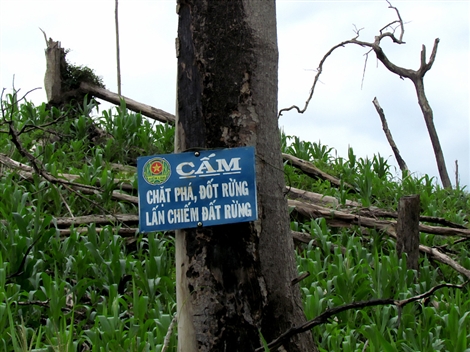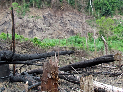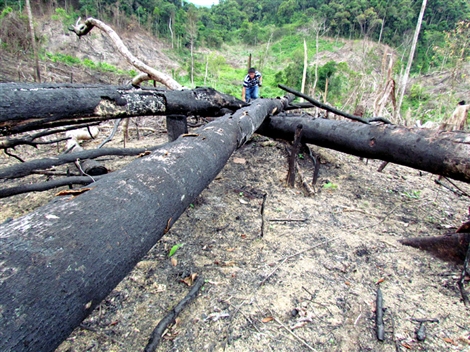 Từ bìa rừng thuộc thôn Sông Chò (Cư San, M”Đrắk, Đắk Lắk), sau hơn 2 giờ đi bộ leo dốc, lội suối dưới những tán rừng rậm, chúng tôi đến khu rừng Đông Ha, thuộc địa bàn xã Khánh Bình. Qua một con dốc đứng, cảnh tượng đập vào mắt chúng tôi là những vạt cây rừng bị chặt ngã ngổn ngang, đốt cháy đen.