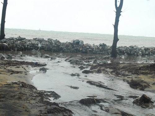 Đoạn đê biển qua xóm Cồn Đâu đã bị sạt lở nặng từ năm 2012, sau nhiều lần kè đá thì hiện đã bị xé toạc, nối biển với phá Tam Giang.