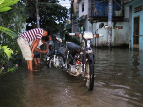 Càng trở về tối mực nước càng cao khiến nhiều hộ dân phải lội bì bõm trong nước. Trong khi đó, nhiều xe cộ lưu thông trên đường Bình Quới đã bị chết máy, nhiều người phải chờ nước rút mới dám ra đường.