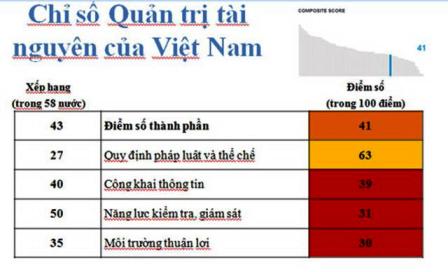 | Theo báo cáo của Viện Giám sát nguồn thu (RWI) về chỉ số quản trị tài nguyên năm 2012, đánh giá sự minh bạch và trách nhiệm của ngành khai thác khoáng sản tại 58 quốc gia, Việt Nam xếp thứ 43, với 41 điểm trên thang điểm 100. |