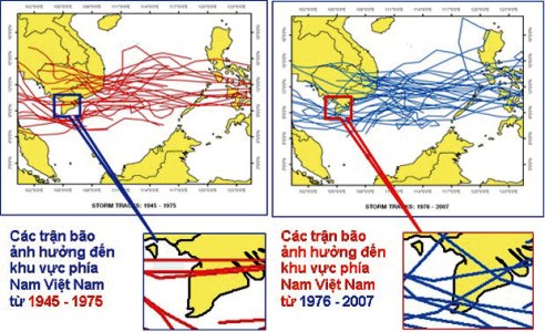 Kết quả nghiên cứu của trung tâm START vùng Đông Nam Á và viện Nghiên cứu biến đổi khí hậu về đường đi các trận bão từ Biển Đông đến vùng Nam bộ trong suốt 60 năm (từ 1945 – 2007) cho thấy số cơn bão đi qua vùng đồng bằng sông Cửu Long có xu hướng tăng lên như một bằng chứng liên quan đến biến đổi khí hậu.