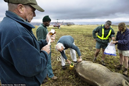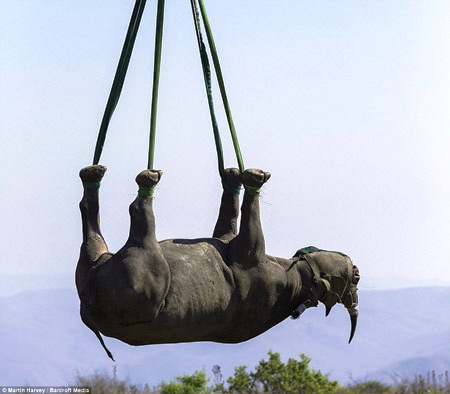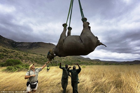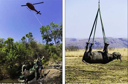 Con tê giác đen quý hiếm được vận chuyển bằng máy bay trực thăng tới khu bảo tồn KwaZulu- Natal, Nam Phi để bảo vệ chúng khỏi những kẻ săn trộm. Các chuyên gia của WWF tiêm thuốc gây mê và bịt mặt con tê giác đen trước khi buộc chân chúng lại để vận chuyển bằng trực thăng.