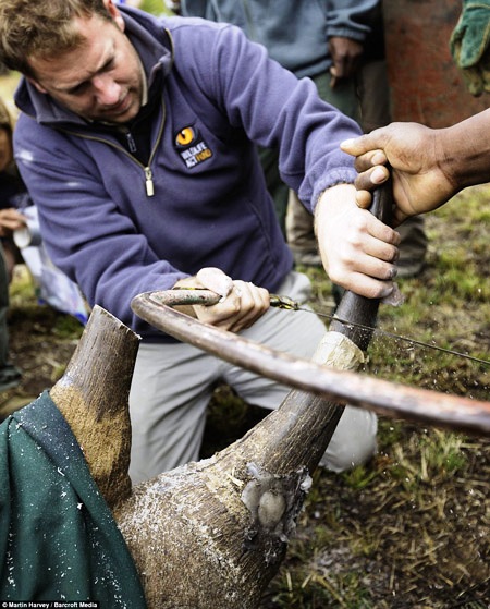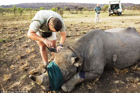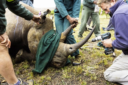 Trước khi những con tê giác được thả tại khu bảo tồn mới, chúng được cưa bỏ sừng. Hành động này của WWF nhằm loại bỏ nguy cơ tê giác đen bị sát hại để cắt lấy sừng của những kẻ săn trộm.