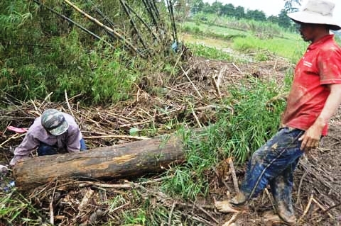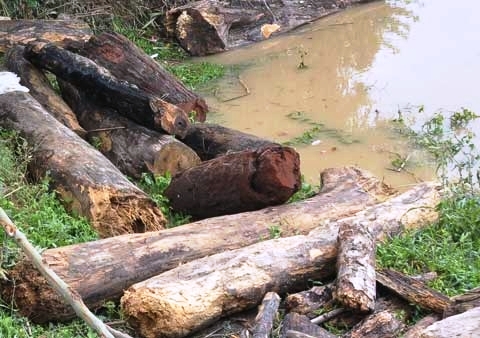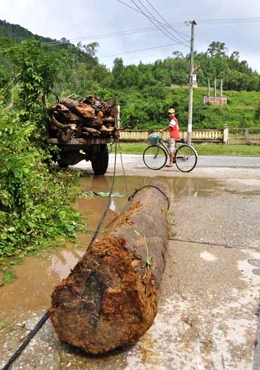 Hàng trăm thân cây lớn có đường kính từ 50-70cm được người dân vớt lên, chất ngổn ngang dọc đường. Có nơi người dân vớt được cả thân cây có đường kính hơn 100cm. Ngoài thân gây gỗ còn nguyên thì nhiều người còn vớt được cả gỗ phách được xẻ rất vuông vức.