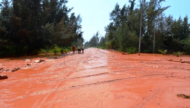 Phần lớn lượng bùn đỏ tràn xuống rừng dương có chiều rộng hơn 150 mét, sau đó trôi xuống biển. Cả một khu vực bờ biển (từ mép nước ra đến ngoài khơi khoảng hơn 200 mét) có chiều dài hơn 6 Km đã bị ảnh hưởng nặng nề. Hơn 10 khu du lịch dọc theo bờ biển thuộc khu vực này hoàn toàn bị phủ bởi bùn đỏ.