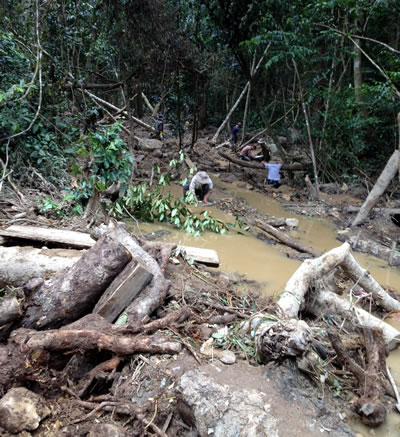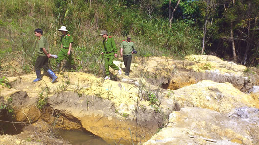 Dọc theo hai bờ con suối là hàng trăm hang hố, vỉa đào nham nhở bị người dân bỏ lại. Nhiều lán, trại vẫn còn sót lại chưa kịp dỡ bỏ. Dòng suối đục ngầu, cả một vùng rừng tan hoang. Anh Mai Thành Trung, Phó trưởng CAX Diê Ya cho biết: Cứ mỗi lần bị truy quét, người dân lại bỏ bãi này chạy đi tìm bãi đá khác, cứ thế mỗi lúc tiến sâu hơn vào rừng. Đến nay đã có tất cả 5 bãi khai thác, trong đó có 2 bãi thuộc địa phận Krông Năng, Đắc Lắc, 3 bãi còn lại thuộc về H. Krông Pa, tỉnh Gia Lai. Mỗi bãi cách nhau khoảng 3-4km đường rừng khiến cho công tác tuần tra, kiểm soát gặp nhiều khó khăn.