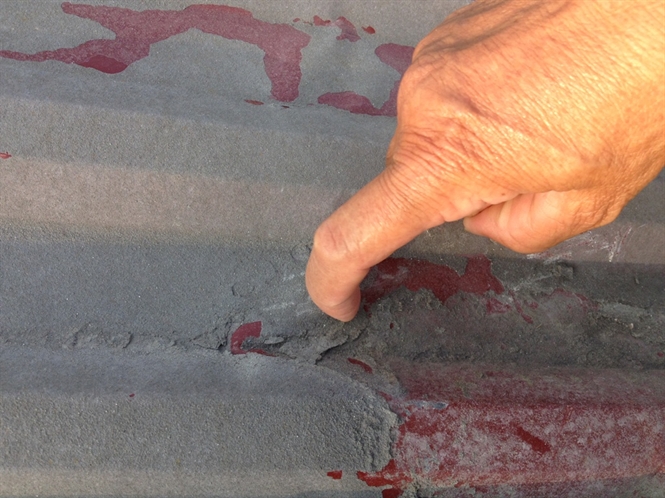 Trên trần nhà bà Lai, tấm tôn đỏ đã bị phủ một lớp bụi, đông kết lại như xi măng. Bà Lai dùng một thanh sắt cạy, gõ mạnh nhiều lần, từng mảng cứng bong ra. Tại những chỗ đó, tấm tôn đỏ bị ăn mòn đến thủng lỗ chỗ.