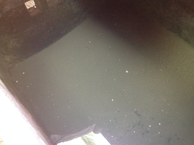 Bể nước ăn dưới sân nhà bà Lai cũng như nhiều hộ dân khác trong xóm còn kinh khủng hơn. Dưới đáy bể, bụi đóng thành bánh, dày cả gang tay. Dùng gậy khuấy mạnh, nước trở lên đục ngầu, đặc quánh như nước cống. “Bể nước nhà tôi che chắn kiểu gì cũng bị bụi vào như vầy. Mỗi lần bơm nước vào phải để lắng cả ngày, gạn lấy phần trong để đun.