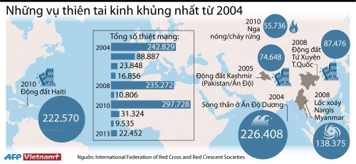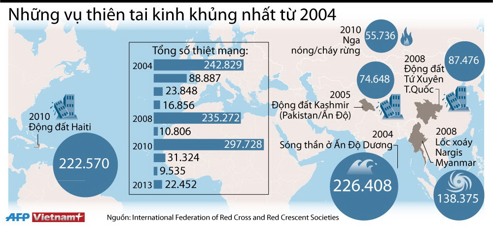 Infographics Những vụ thiên tai kinh khủng nhất từ 2004 20/10/2014 FacebookTwitterPinterestWhatsApp ThienNhien.Net – Từ năm 2004 đến nay, thế giới đã chứng kiến hàng chục vụ thiên tai kinh hoàng, cướp đi mạng sống của hàng trăm ngàn người. Đó là Sóng thần ở Ấn Độ Dương, Động đất ở Haiti, lốc xoáy ở Myanmar hay cháy rừng ở Nga. Không có bài viết cùng chủ đề.