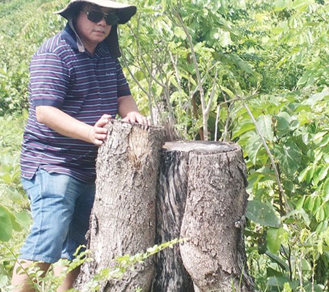 Lội qua con suối cạn vào sâu trong rừng, hàng trăm gốc cây lớn nhỏ ngửa mặt nhìn trời. P. nói: “Cây rừng bị triệt hạ đều là gỗ lim, dầu, gáo… toàn loại gỗ quý”. Theo quan sát của chúng tôi, các gốc cây có đường kính từ 20 đến 70 cm. Thậm chí nhiều cây đường kính dưới 15 cm cũng bị lâm tặc đốn hạ bằng cưa máy. Lâm tặc tập kết gỗ bên con suối cạn rồi vận chuyển về xuôi.