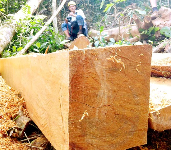 Đi cùng mấy người dẫn đường địa phương, sáng 12-11, chúng tôi có mặt tại những nơi lâm tặc đốn hạ gỗ quý của rừng phòng hộ giáp ranh xã Cư Klong và Cư Đrăng. Bỏ xe máy gần trại bò Ma Thiên (thôn Cư Klong, xã Cư Klong), chúng tôi bắt đầu hành trình lên đỉnh núi Cư Klong, thuộc lâm phần tiểu khu 306 do xã Cư Klong quản lý. Dốc núi cao, cây cối chằng chịt chặn lối đi nên mấy người dẫn đường phải xông lên trước phát dọn. Vất vả vượt qua chặng đường rừng hơn 1km, những cây gỗ quý vừa bị lâm tặc đốn hạ đầu tiên cũng xuất hiện. Bốc nắm mùn cưa chưa ráo nước cạnh một cây gỗ quý mới bị chặt có đường kính hơn 1m, người dẫn đường cho biết đó là cây gỗ bình linh (gỗ quý nhóm III).
