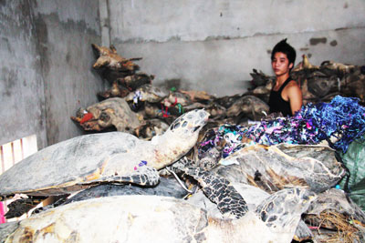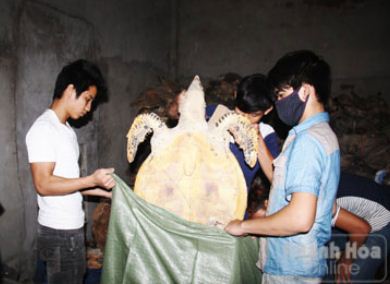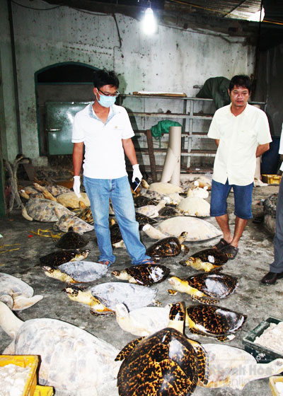 Chiều 20-11, khi kho hàng của ông Hoàng Tuấn Hải (trú thôn Phước Lợi, xã Phước Đồng, TP. Nha Trang) được cơ quan Công an mở ra, mùi phoóc-mon xộc lên nồng nặc. Dưới sàn, trong kho, đầy rẫy rùa biển khô. Tại xưởng chế tác ở thôn Phước Lợi, cơ quan chức năng thu được gần cả ngàn con rùa biển đã làm khô còn nguyên mai, đầu, chân, cân được gần 590kg. Còn ở nhà kho tại thôn Phước Hạ, cơ quan chức năng cũng thu được hàng ngàn con rùa biển được làm khô với khối lượng hơn 770kg.