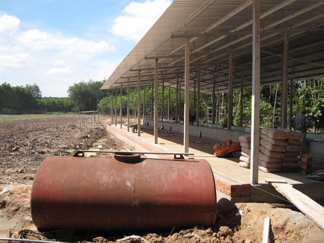 Đến nơi, hình ảnh đập vào mắt đầu tiên là một dãy chuồng trại được xây dựng xong phần thô, bên cạnh là đồng cỏ voi lú nhú nằm lọt thỏm trong khu vực vườn cao đang khai thác.