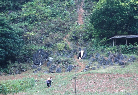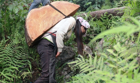 Lần theo đường mòn hun hút từ bản Nà Tênh ngược lên biên giới, chúng tôi gặp rải rác những người phụ nữ lùi lũi gùi những thớt nghiến trên lưng. Rặt chỉ có phụ nữ gùi nghiến. Người dăm thớt, người ba thớt…, mỗi thớt dài rộng chừng 25-40 cm, dày gần một gang tay người lớn. Chúng tôi cố ý trò chuyện với một cô gái, thậm chí xin gùi thử khối nghiến cô đang gùi nhưng… bất lực. Cô gái cho chúng tôi biết mỗi cân nghiến vác đến điểm tập trung (bên kia biên giới) được chủ hàng trả một nghìn đồng. Hỏi “một ngày vác được bao nhiêu cân?”, cô bảo không biết.
