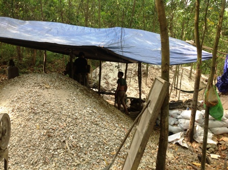 Tôi tiến về phía 2 dãy lán nghỉ, bên cạnh dãy sạp hơn chục chiếc võng bạt mắc nối tiếp nhau, một thanh niên nói giọng miền Bắc đang hý húi làm thịt con gà, niềm nở mời chúng tôi ở lại ăn cơm, tranh thủ mấy người thanh niên lại chúi đầu vào công việc, tôi rẽ tạt lên sườn núi, phát hiện một chiếc hố dưới là những chiếc máy nổ Trung Quốc, máy nghiền đá phủ bạt kín, cả một đống dây dẫn nước dài cả trăm mét còn mới nguyên, chứng tổ các đối tượng khai thác vàng nơi đây đang chuẩn bị cho một quy mô khai thác rất rầm rộ. Sau một hồi ngó nghiêng, chúng tôi chào mấy thanh niên xuống núi, không bận tâm chúng tôi là ai, họ lại tiếp tục vào công việc, tiếng máy nổ lại giòn rã trên sườn núi.