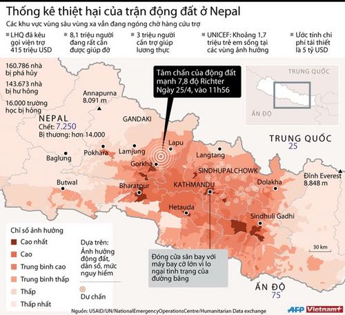 Theo thống kê, trận động đất ở Nepal đã khiến gần 161.000 ngôi nhà bị phá hủy, 143.673 ngôi nhà bị hư hỏng, 16.000 trường học bị hỏng.