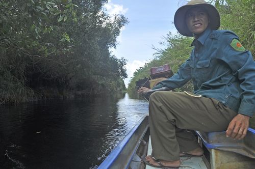 Mới 8h sáng, nắng đã chói chang tỏa hơi nóng xuống nơi “sơn cùng thủy tận” U Minh Hạ. Chúng tôi theo chân anh Nguyễn Văn Liêm, Phó hạt trưởng Hạt kiểm lâm vườn quốc gia U Minh Hạ cùng một số anh em kiểm lâm đi tuần tra trong ruột rừng. Qua cổng chính dẫn vào Vườn quốc gia U Minh Hạ, những đám rừng khô cằn hiện ra; phía dưới đất những đám cỏ đã chuyển màu khô, trên những thân cây tràm dây dớn quấn quanh đã úa vàng, thảm thực vật dưới rừng khô rong, mực nước các kênh trục đều rút xuống sắp tới mức cạn kiệt.