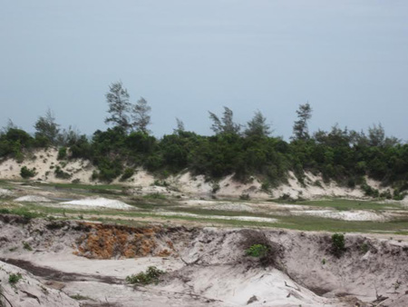 Sau khi rời khỏi trụ sở Công ty Vân Hải, chúng tôi nhờ một người dân dẫn đến khu vực ao Ren và Sơn Hào. Tại thời điểm phóng viên chứng kiến, hai khu vực nãy vẫn nhấp nhô bởi hố sâu. Đi hàng trăm mét mới thấy một cây Phi Lao nhỏ nằm quặt quẹo trên cát.