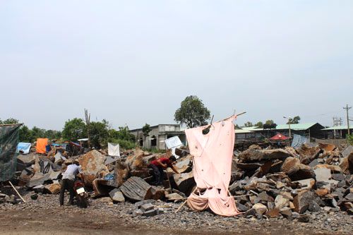 Một “cò” đất ở trong vùng cho biết khu bãi đá này được khai thác cách đây khoảng 10 năm do một phụ nữ lấy chồng Hàn Quốc làm chủ nên được mọi người gọi là “mỏ bà Hàn Quốc”. Sau đó, nhiều người thuê hoặc mua đất bằng hình thức viết giấy tay không qua chính quyền địa phương và khai thác đá ồ ạt. Khi chúng tôi đến, xuất hiện một số đối tượng dáng vẻ bặm trợn ra “hỏi thăm” với đầy vẻ hăm dọa.