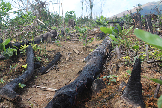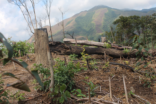 Ngày 18.11.2015, chúng tôi theo những người dân thôn Đồng Quặng vượt núi, băng rừng lên “điểm nóng” – tiểu khu 77A. Ngay cửa rừng vẫn còn sót lại chiếc lều, mà theo người dân, là của lâm tặc, cùng những bộ nồi niêu, bát đĩa. Không còn bóng dáng cây nào đáng giá của khu rừng tự nhiên vốn xanh ngắt; thay vào đó là những cây keo mới trồng, nhưng không thể phủ lấp kịp vô số những gốc cây mới bị đốn hạ. Có những ngọn đồi nhuốm cả một màu đen xám xịt do sau khi cây bị đốn hạ.