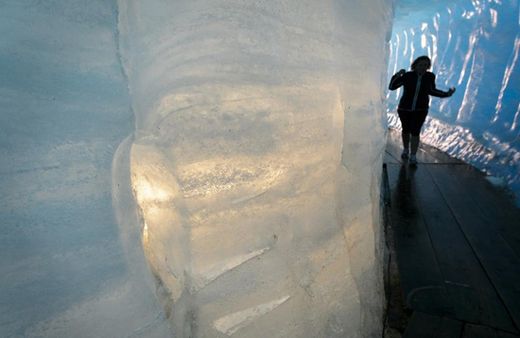 Khu vực dưới lớp chăn này chính là điểm du lịch hấp dẫn của Thụy Sĩ – hang băng đã được tạo tác tại đây hàng năm kể từ 1870 với bức tường băng màu xanh lóng lánh hút hồn.
