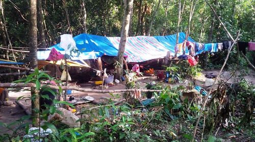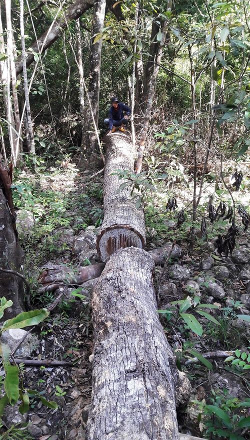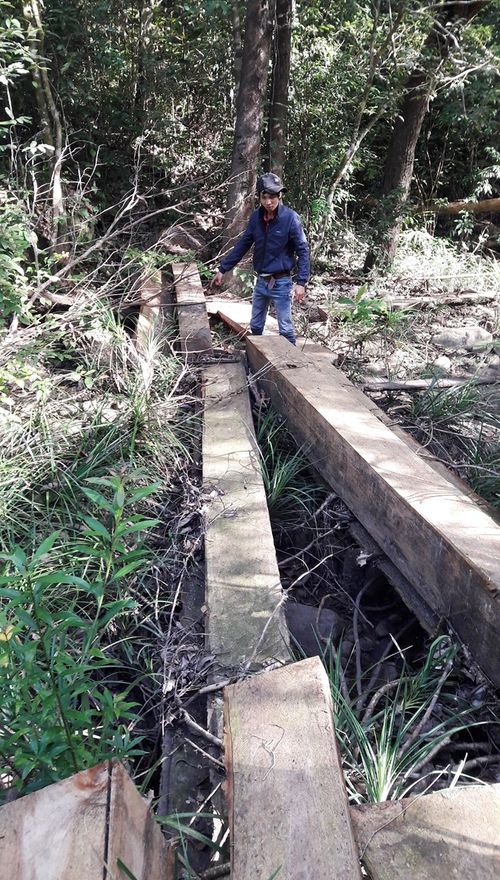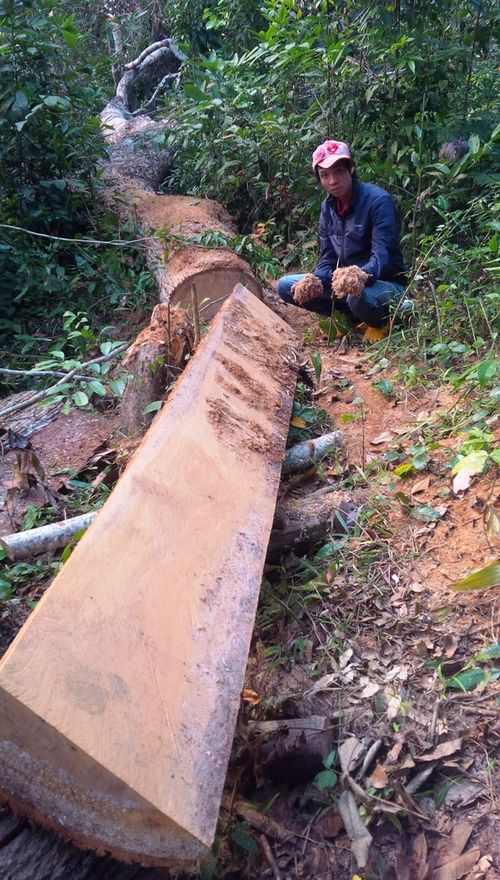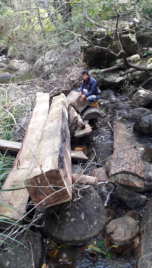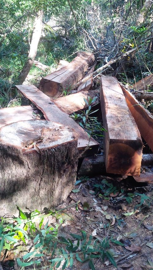 Dưới đây là chùm ảnh những cây gỗ bị đốn nằm la liệt trong rừng và lán trại lâm tặc ngang nhiên dựng lên: