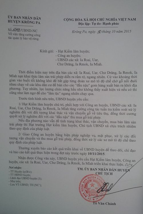 Cây bị đốn hạ, xẻ thịt” như mặc định rừng là của lâm tặc.Những thân gỗ quý, đường kính 1m bị chặt hạ không thương tiếc.Nhựa cây rỉ như máu.Để phá rừng lâu dài, lâm tặc công khai dựng lán trại.Ai đã bảo kê cho lâm tặc phá nát rừng Krông Pa?Rừng bị phá từ từ nhiều năm nay nhưng không ai đứng ra chịu trách nhiệm.Lâm tặc xẻ gỗ trong rừng như “đại công trường”.Vỏ can xăng, dầu nhớt được lâm tặc bỏ lại nằm vương vãi cùng những cây gỗ bị đốn hạ.Những hình ảnh phá rừng trên nằm tại tiểu khu 1321 thuộc lâm phần Ban QLRPH Ia Rsai.Công văn của UBND huyện Krông Pa nhìn nhận việc phá rừng rất phức tạp.… thế nhưng báo cáo của sở NNPTNT Gia Lai lại đổ lỗi cho “người dân tộc thiểu số nghèo”, “không có chuyện khai thác lâm sản mục đích mua bán”.Với báo cáo của sở NNPTNT Gia Lai, không khó để nhận biết ai đã bảo kê cho lâm tặc dựng lán trại, tàn sát rừng Krông Pa.Ngoài bìa rừng tấm bảng bê tông ghim: “Rừng là vàng nếu biết bảo vệ….”, nhưng ai bảo vệ rừng Krông Pa khi lâm tặc được bảo kê, tiếp tay?