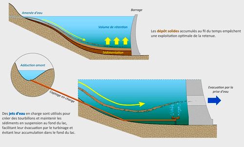 Theo phương pháp vừa được các nhà khoa học tại EPFL nghiên cứu, họ sẽ đặt các vòi phun nước công suất lớn dưới đáy các đập để tạo thành các dòng chảy ngầm đẩy lớp cặn không lắng xuống đáy và nhờ đó sẽ chảy đi ngay theo dòng nước.