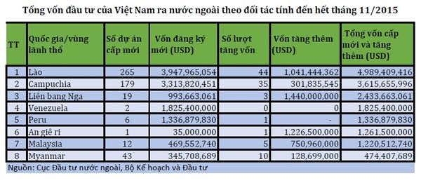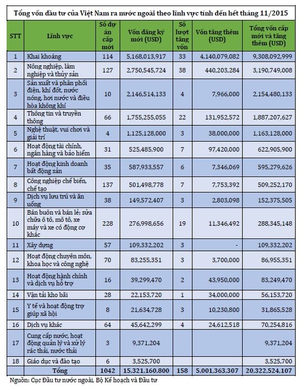 Song hành với xu hướng hội nhập và đầu tư của thế giới, hoạt động đầu tư ra nước ngoài của Việt Nam cũng đạt được kết quả đáng kể. Tính đến cuối tháng 11/2015, Việt Nam đã đầu tư ra 68 quốc gia và vùng lãnh thổ với tổng vốn đăng ký mới và đăng ký tăng thêm trên 20 tỷ USD, trong đó các lĩnh vực dẫn đầu là khai khoáng với hơn 9,3 tỷ USD; nông lâm thủy sản 3,19 tỷ USD; sản xuất và phân phối điện, khí đốt trên 2,1 tỷ USD…