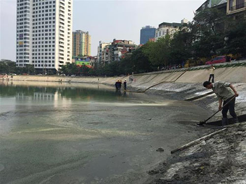 Được biết, ngày 4-5, Ban quản lý dự án thoát nước Hà Nội đã tổ chức tăng cường nhân lực vớt toàn bộ rác, tập chất, xác tảo chết tại khu vực đối diện số nhà 20 Phạm Duy Thông, đồng thời tiến hành phu, đổ hóa chất diệt tảo và khử mùi chống ô nhiễm. Xác tạo sau khi vớt được cho vào bao tải, rắc vôi che kín để chống ô nhiễm, tiến hành rắc thả hóa chất.