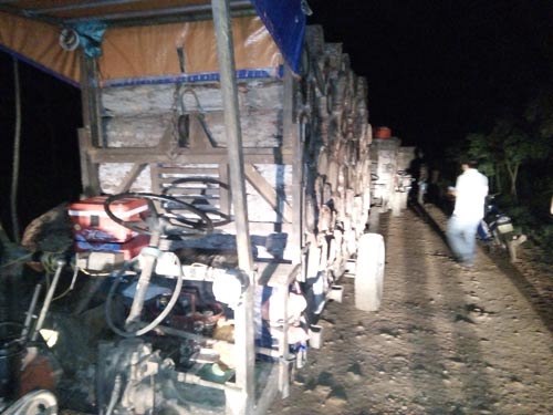 Theo hướng một nhóm lâm tặc vừa chở gỗ ra, chúng tôi tiến sâu vào rừng. Chưa tới cửa rừng, chúng tôi đã nghe tiếng cưa máy xẻ gỗ gầm rú đinh tai nhức óc. Ngay bìa rừng, 4 người đang chất khoảng 10 khúc gỗ đã được xẻ, mỗi khúc có đường kính khoảng 30-40 cm, dài khoảng 2 m lên các xe máy “độ”, “chế” chuẩn bị đưa ra khỏi rừng. “Trước khi vào rừng, tôi đã gọi điện xin rồi nên cứ đi ra thôi, không phải sợ ai bắt cả” – một người thản nhiên nói khi chúng tôi thắc mắc. Anh ta còn khoe bí quyết để chở được gỗ trên những lối mòn trơn trợt vì mưa, bánh xe phải quấn xích tạo ma sát. “Trước đây, khu rừng này có rất nhiều loại gỗ quý nhưng giờ chủ yếu chỉ là gỗ tạp” – anh ta cho biết.