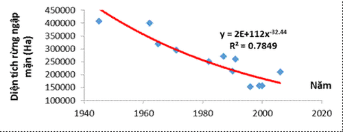 Theo nhiều nguồn thống kê, năm 1943 cả nước ta có tổng diện tích khoảng 408.500 ha rừng ngập mặn, trong đó có 329.000 ha ở miền Nam. Trong giai đoạn chiến tranh, từ 1962 đến 1975, rừng ngập mặn nguyên sinh giảm mạnh do thay đổi trong sử dụng đất qua quá trình hình thành đô thị và canh tác, như mở rộng khu vực nuôi tôm. Từ 1990 đến 2000, gần 30% rừng ngập mặn của Việt Nam đã bị phá hủy. Tình trạng phá rừng ngập mặn để nuôi tôm đã góp phần gây nên hiện tượng xói lở bờ biển nghiêm trọng, xâm nhập mặn và giảm đa dạng sinh học các loài thủy sinh. Nhìn nhận những mất mát từ phá hủy rừng ngập mặn, nhiều nỗ lực tái trồng rừng và quản lý rừng ngập mặn đã được triển khai và nhờ vậy diện tích rừng ngập mặn của Việt Nam đã tăng lên mức 209.000 ha vào năm 2006.