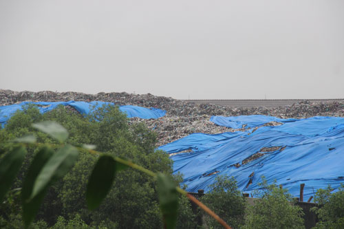 Tiếp nhận phản ánh của người dân, phóng viên đã đến khu vực nhà máy tìm hiểu vụ việc. Còn cách xa hơn 2 km nhưng chúng tôi có thể thấy bãi rác khổng lồ nằm lộ thiên, chỉ được phủ bạt đơn sơ. Dù được xây tường bao chắn nhưng do lượng rác quá lớn nên mùi hôi thối vẫn bốc ra nồng nặc. Nước rỉ rác đen ngòm chảy ra ngoài, theo các mương nước trôi đi.